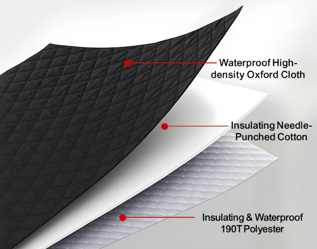 Equipped with 3 layers of fabric, engineered for exceptional durability, this product is crafted from waterproof high-density Oxford cloth, insulating needle-punched cotton, and 190T polyester. It offers superior heat insulation, moisture resistance, and long-lasting, mold-free protection.